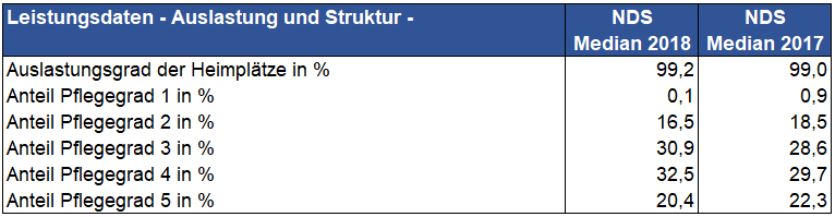 Für das Geschäftsjahr 2018 sind zuerst die positiven Faktoren hervorzuheben: Der befürchtete Einbruch der Pflegestruktur im Jahr Eins nach der Überleitung der Bewohner in Pflegegrade ist regelmäßig nicht in dem befürchteten Maße eingetreten. Dies belegen auch die Kennzahlen aus unserem Betriebsvergleich der von uns geprüften niedersächsischen Altenhilfeeinrichtungen: Während der prozentuale Anteil des Pflegegrades 5 von 20,4 % gegenüber dem Vorjahr (22,3 %) nur leicht rückläufig ist, hat sich der prozentuale Anteil der Pflegegrade 4 (32,5 %; Vorjahr 29,7 %) und 3 (30,9 %; Vorjahr 28,6 %) sogar erhöht. Der von einigen Trägern prophezeite "Bumerang-Effekt", dass das zusätzliche Personal, welches im Rahmen der Überleitung eingestellt werden sollte, nach dem Wegfall des Bestandsschutzes nicht mehr benötigt werde, ist zumindest anhand der Zahlen des Jahres 2018 nicht zu beobachten.