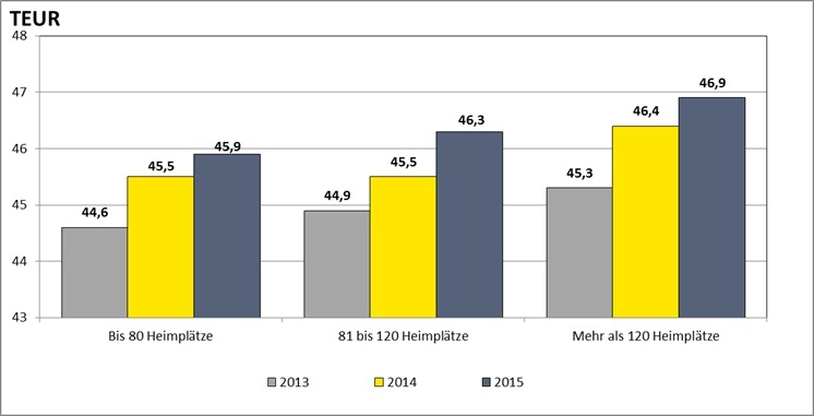 Unabhängig von ihrer Größe ist ein positives Jahresergebnis regelmäßig ein angestrebtes Ziel für die Mehrzahl der Einrichtungen. Für das durchschnittliche Altenheim ergibt sich im Jahr 2015 ein Jahresüberschuss von TEUR 62 (Vorjahr: TEUR 57). Die Verbesserung des Jahresergebnisses ergibt sich im Wesentlichen aus dem pflegesatzfinanzierten Bereich (Betriebsergebnis I). Das Betriebsergebnis I verbesserte sich im Median um TEUR 51 auf einen Überschuss von TEUR 14. Bemerkenswert ist, dass 45 % der Altenhilfeeinrichtungen in unserem Betriebsvergleich kein positives Betriebsergebnis I erzielen konnten; 25 % der Einrichtungen haben sogar einen operativen Verlust von über TEUR 81 erzielt. Die im Jahresvergleich positive Entwicklung im Betriebsergebnis I ist im Wesentlichen auf den gesunkenen Sachaufwand zurückzuführen. Der Median 2015 beträgt TEUR 812 und ist damit um TEUR 68 gegenüber dem Vorjahr gesunken. Gleichwohl sind die Pflegesätze für viele Einrichtungen weiterhin nicht auskömmlich. Dies ist insbesondere darauf zurückzuführen, dass die AVR Caritas weiterhin nicht vollständig im Pflegesatz berücksichtigt wird. Die Personalaufwendungen je Vollkraft zeigt nachfolgende Übersicht: