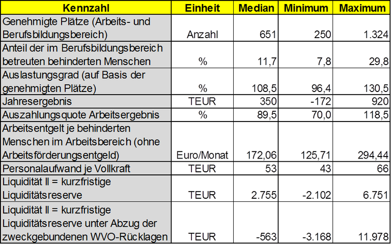 Die Ausschüttungsquoten (Auszahlung von Arbeitsentgelten aus dem Arbeitsergebnis der Werkstätten an die Beschäftigten) liegen zwischen 70,0 % im Minimum und 118,5 % im Maximum und damit im Median mit 89,5 % deutlich über der gesetzlich vorgesehenen Mindestquote von 70 %. Eine hohe Auszahlungsquote führt dazu, dass weniger Volumen für die Bildung der Rücklagen für Ersatz- und Modernisierungsinvestitionen zur Verfügung steht.