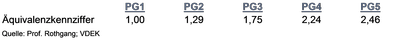 Die Pflegestruktur beschreibt die durchschnittliche, mit dem Schweregrad bewertete, Pflegeleistung einer Pflegeeinrichtung. Der Schweregrad in unserem Betriebsvergleich wurde anhand von Äquivalenzkennziffern (angelehnt an Prof. Rothgang, Umrechnungstabellen des VDEK zur Umsetzung des Pflegestärkungsgesetz II - im Folgenden kurz: "PSG II" -) bewertet. Dabei kommen folgende Äquivalenzkennziffern für die jeweiligen Pflegegrade zur Anwendung: