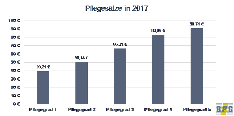 Wie bereits unter 1.2. beschrieben, erfolgte die Einstufung der Bewohner in 2017 erstmals nach Pflegegraden, wobei die Überleitung von Pflegestufen zu Pflegegraden nach einem mathematischen Verfahren erfolgt ist. Um negative Effekte für die Pflegeeinrichtungen aus der Umstellung auf den neuen Pflegebedürftigkeitsbegriff (und damit die Umstellung auf die neuen Pflegegrade) abzumildern, wurden sog. "PSG II-Zuschläge" vereinbart. Die Umsetzung der PSG II-Zuschläge ist auf Länderebene jedoch ganz unterschiedlich erfolgt. In Niedersachsen wurde dieser zum Beispiel als rein monetärer Zuschlag vereinbart; in Nordrhein-Westfalen dagegen wurde der Zuschlag durch Gewährung von Zusatzpersonal im Pflegedienst von 6,8 % im Pflegesatz berücksichtigt.