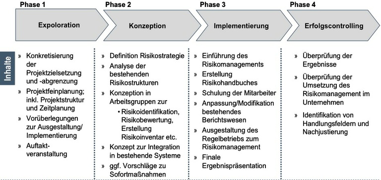 Die initiale Implementierung des Risikomanagement-Systems erfolgt in Form eines Projekts. Das Projekt unterteilt sich in 4 Phasen: Exploration, Konzeption, Implementierung und Erfolgscontrolling.