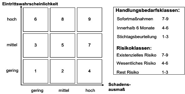 Nach der Vorauswahl wird mit der differenzierten Bewertung der ausgewählten Risiken nach Eintrittswahrscheinlichkeit und Schadensausmaß begonnen. Die Skala der Einordnung ist hausindividuell zu treffen. Die Eintrittswahrscheinlichkeit kann sich bspw. auf die reine Wahrscheinlichkeit oder aber auf Jahresangaben beziehen.