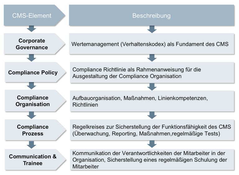 Das Compliance Managementsystem muss auf die individuellen Besonderheiten und Bedürfnisse jeder einzelnen sozial-caritativen oder kommunalen Einrichtungen wie Krankenhäuser, Altenhilfeeinrichtungen, Behindertenwerkstätten, Jugendhilfeeinrichtungen und Caritasverbänden angepasst werden. Dennoch haben sich in der Praxis gewisse Elemente herausgebildet, die einer Vielzahl von Systemen zugrunde liegen: