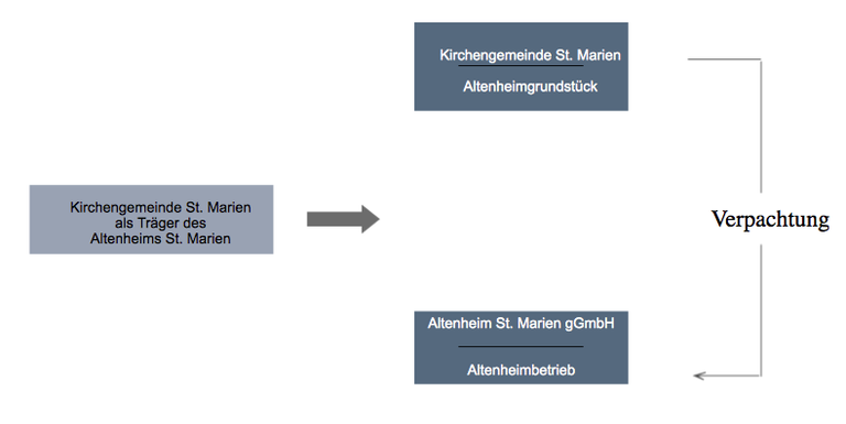 Häufigster Fall der Betriebsaufspaltung ist die Ausgliederung des Altenheimbetriebs aus einer Kirchengemeinde. Die Kirchengemeinde bleibt im Rahmen der Betriebsaufspaltung Eigentümer des Grundstücks und stellt es der neu gegründeten Altenheimbetriebs-GmbH miet- oder pachtweise zur Verfügung.