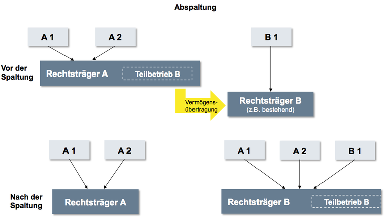 Die Anteilsgewährung an die Gesellschafter des ausgliedernden Rechtsträgers kennzeichnet die Abspaltung von Vermögensgegenständen, Betrieben bzw. Betriebsteilen. Dabei ist sowohl die Abspaltung im Wege der Neugründung eines Rechtsträgers möglich als auch die Abspaltung zur Aufnahme des abgespaltenen Vermögens in einen bereits bestehenden Rechtsträger. Im Rahmen der Abspaltung von Betrieben bzw. Teilbetrieben erhalten die Gesellschafter des ausgliedernden Rechtsträgers Anteile an dem übernehmenden Rechtsträger der übertragenen Vermögenswerte. Gerade bei größeren Unternehmensverbünden bietet sich dieser Durchführungsweg an. Dabei kann durch unterschiedliche Regelungen eine optimale Ausgestaltung der künftigen Anteilsrechte erreicht werden.
