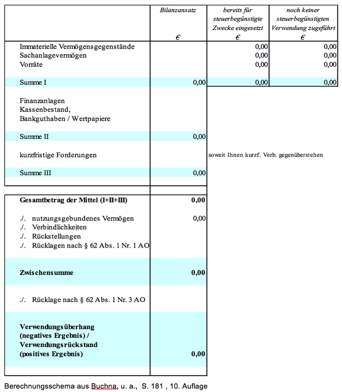 Eine dieser Vorschriften ist der in § 55 AO geregelte Grundsatz der Selbstlosigkeit. Teil dieses Grundsatzes ist, dass eine steuerbegünstigte Körperschaft die ihr zur Verfügung stehenden Mittel (Geld- oder Sachmittel) grundsätzlich zeitnah, das bedeutet innerhalb von zwei Jahren nach Zufluss, für steuerbegünstigte Zwecke zu verwenden hat. Ob eine solche zeitnahe Verwendung erfolgt, ist anhand einer Mittelverwendungsrechnung zu prüfen. In der Mittelverwendungsrechnung werden sämtliche der Körperschaft zur Verwendung stehende Mittel, die in Geld- oder Sachwert bestehen, aufgeführt und davon die bereits für steuerbegünstigte Zwecke verwendeten Mittel sowie die ausnahmsweise nicht zeitnah zu verwendenden Mittel (z.B. zulässig gebildete Rücklagen oder das zur Erhaltung der Körperschaft dienende Kapital) abgezogen. Besteht ein Verwendungsrückstand wurden nicht alle der Körperschaft zur Verwendung stehenden Mittel zeitnah verwendet, was dem Gebot der Selbstlosigkeit widerspricht.